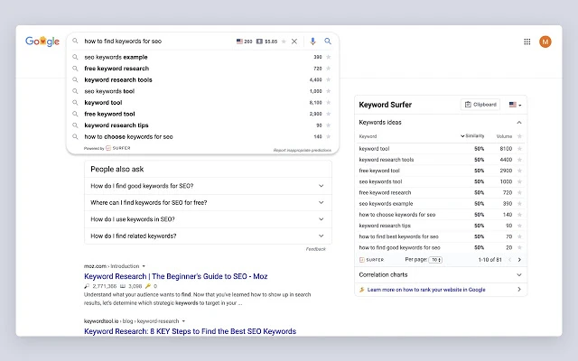 This all-arounder provides a wealth of data for free. You can check domain-level traffic estimations, local and global keyword volumes, and keyword suggestions. You can also use Keyword Surfer to look up domain-level backlink counts. Backlinks are one of the critical factors in improving SERP (search engine page results).