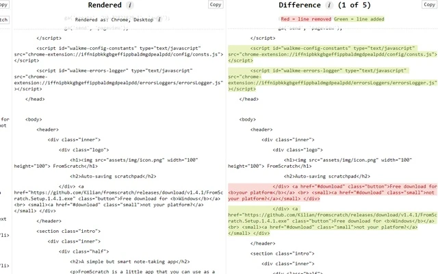 View Rendered Source three sections. There is the raw source code page, the rendered page after the source has been interpreted, and finally, the difference page that occurs when JavaScript has modified the document object model (DOM). Any differences between the raw and rendered versions are flagged via line-by-line highlights.