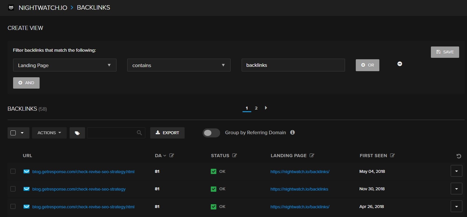 Segmenting backlinks, just like segmenting keywords explained above, is a great way to organize your wild backlinks list. It gives you an idea of your link building efforts and backlink quality distribution as well as helps you focus on the segments you prioritize.