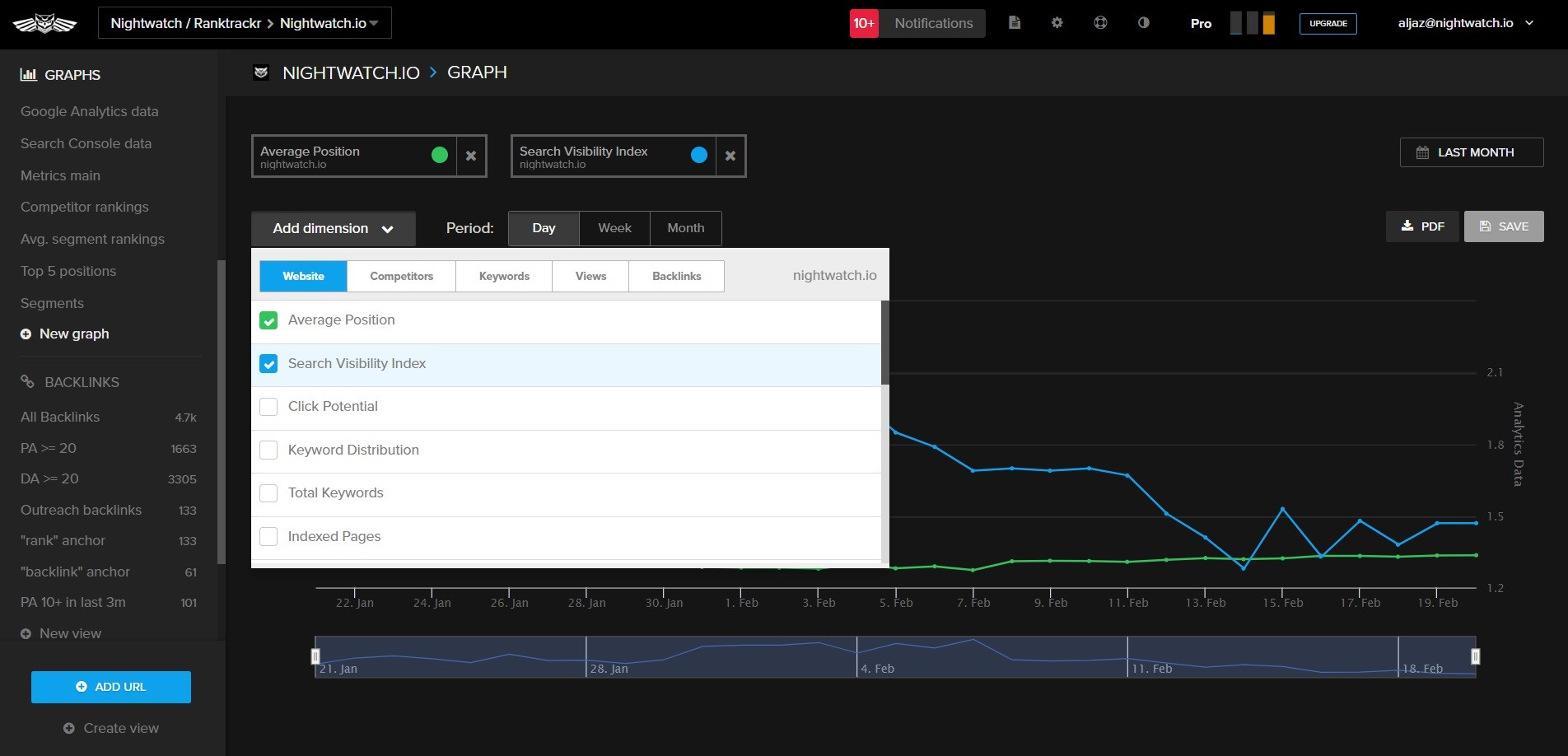 How to: On your Nightwatch graph, select “Average rank” under Website. Another dimension you can put on the same graph is the total number of tracked keywords because the average rank is likely going to change when you add or remove tracked keywords.