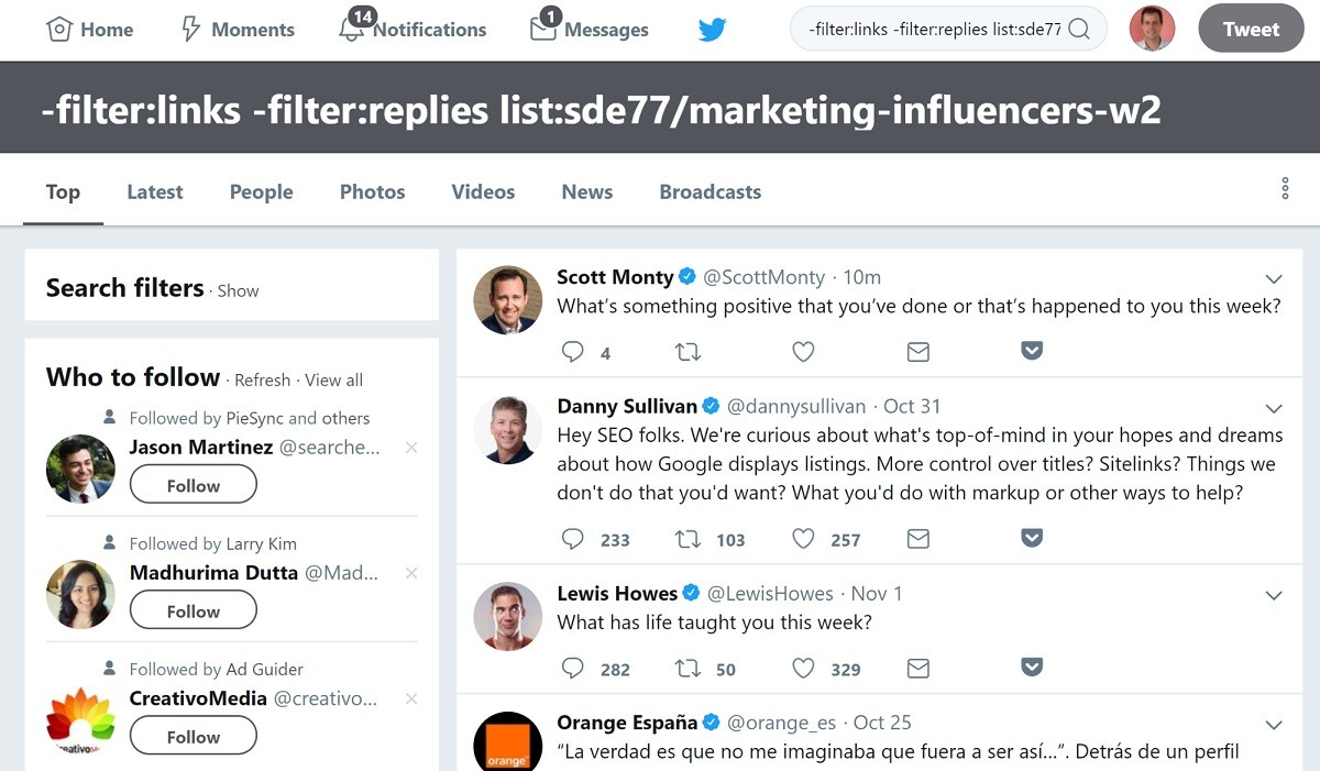 On Twitter, put the influencers in a Twitter list and view their tweets by putting the following string in Twitter’s search box (my list is called “marketing influencers w2”). Here is a search string I use to find questions tweeted by people belonging to this list — reacting to these questions is a great way to engage: -filter:links -filter:replies list:sde77/marketing-influencers-w2.