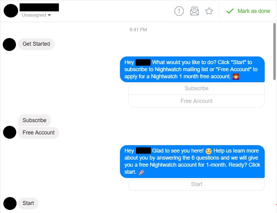 One of the most effective social media lead generation techniques that we successfully implemented in 2018 was a questionnaire using Facebook Messenger. It would reward the participants with a 1-month free account of our tool, Nightwatch.