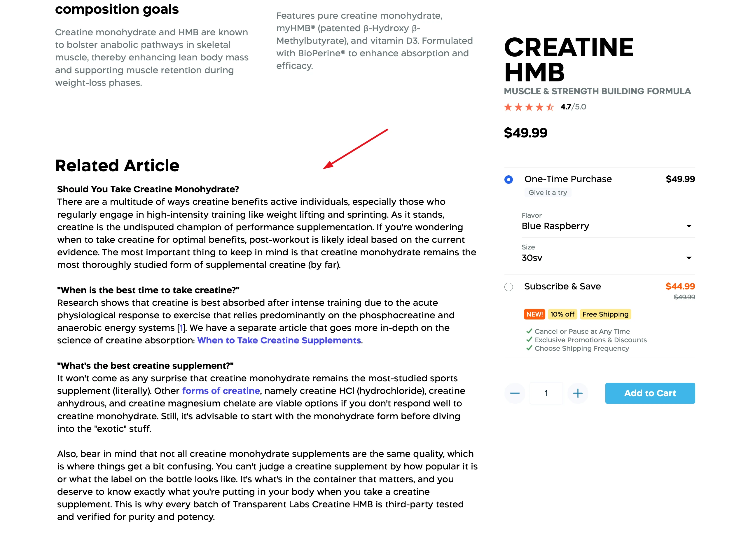 You can apply this tactic to product pages as well as articles. For instance, this creatine supplement from Transparent Labs has a section near the bottom that answers some of the most common queries shoppers will have about creatine. Those who are unsure if they need it or how to use it will greatly benefit from it.
