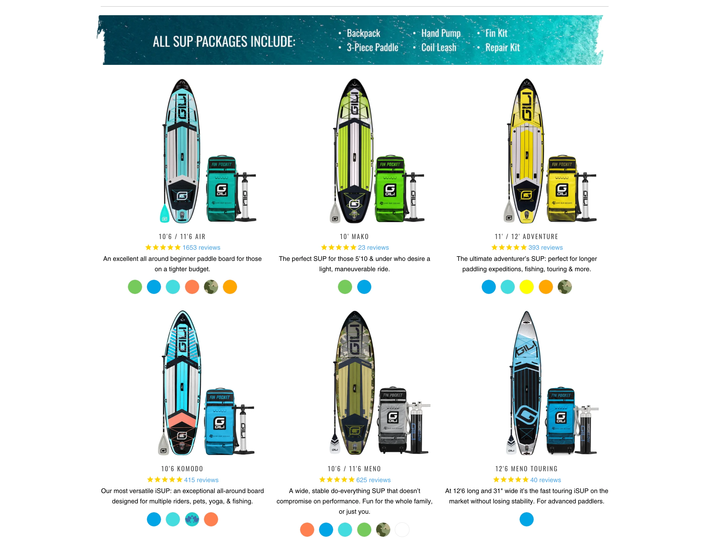 Here is an example on Gili’s SUP collections page. The page comes with plenty of photos that show the products first, before they dive into the difference between models and the best way to choose a board.